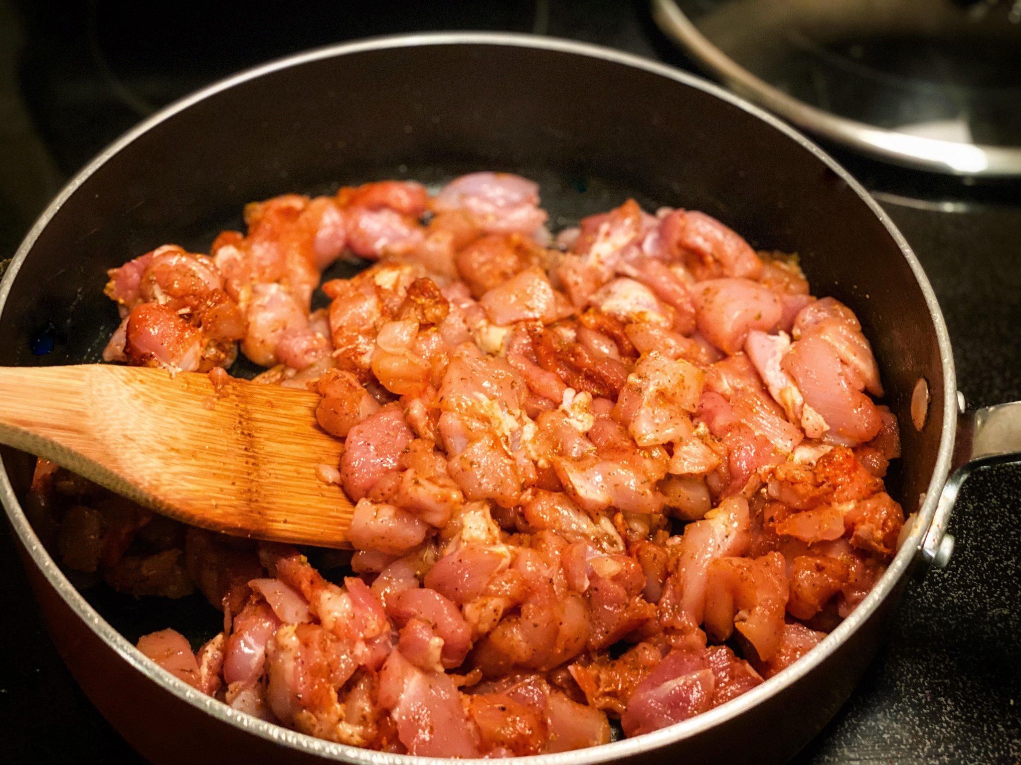 Add all the spices to the chicken and mix so that they cover all the pieces. In a pan over medium heat, drizzle a little bit of olive oil.